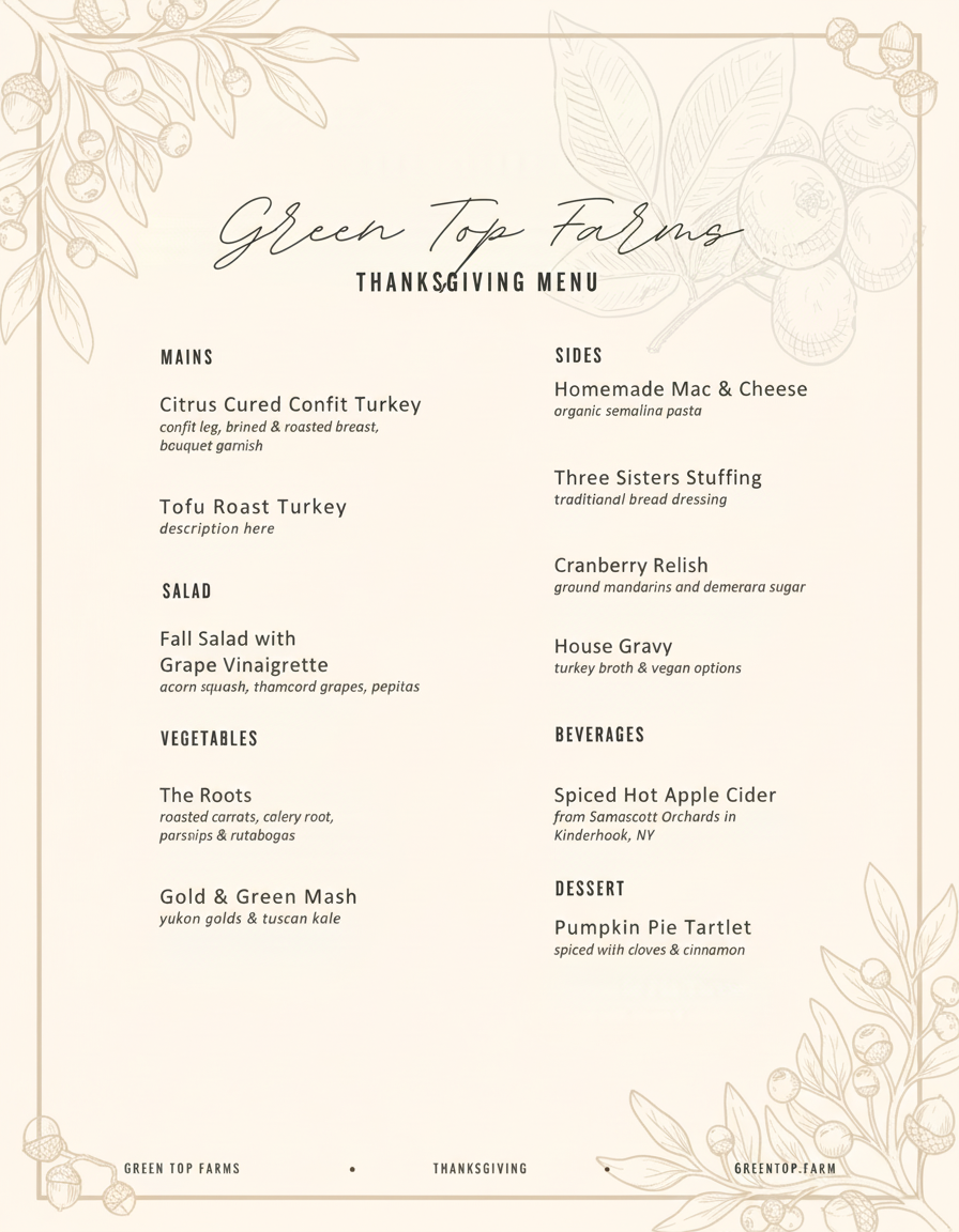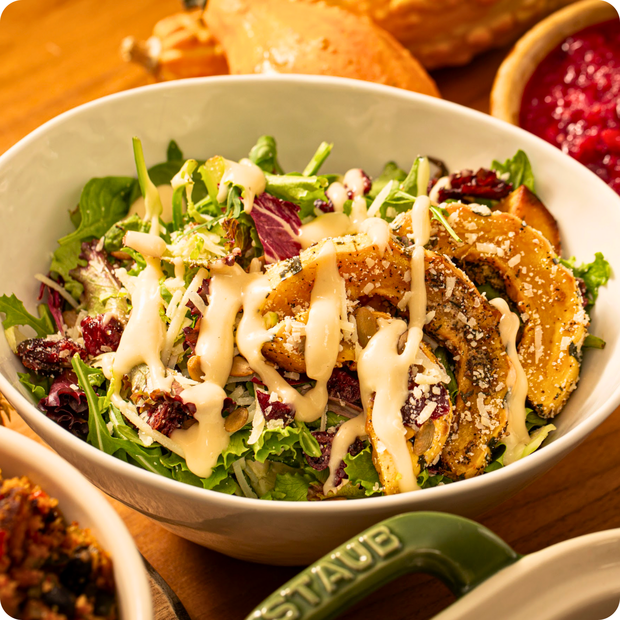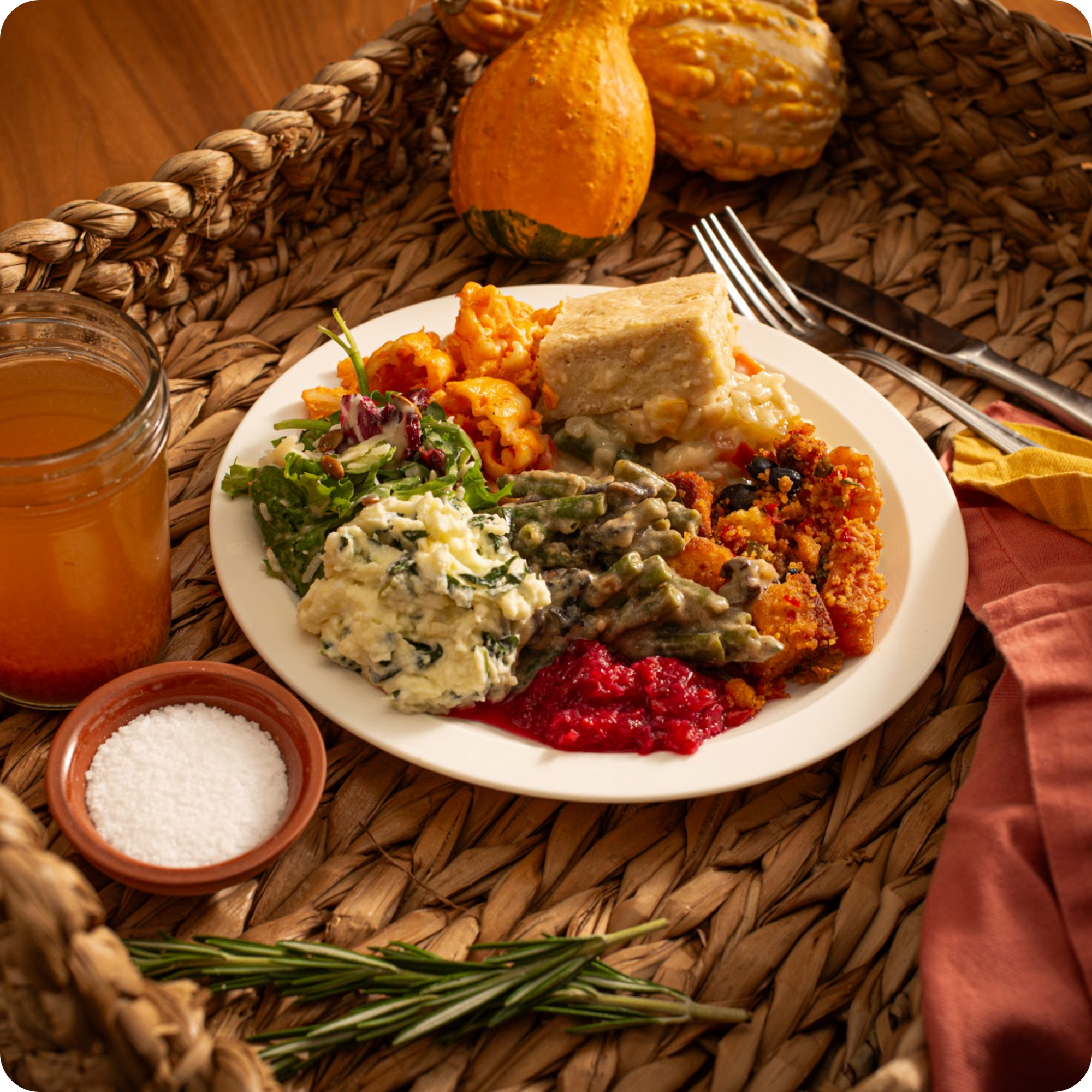 This restaurant-quality menu from our team of talented chefs serves as a connection to the region's harvest. Some of our favorite family dishes meet expert precision with sous vide turkey breast, homemade cider from peak New York State apples, and traditional bread dressing. Order part of the menu to complete your Friendsiving or cater our full menu.